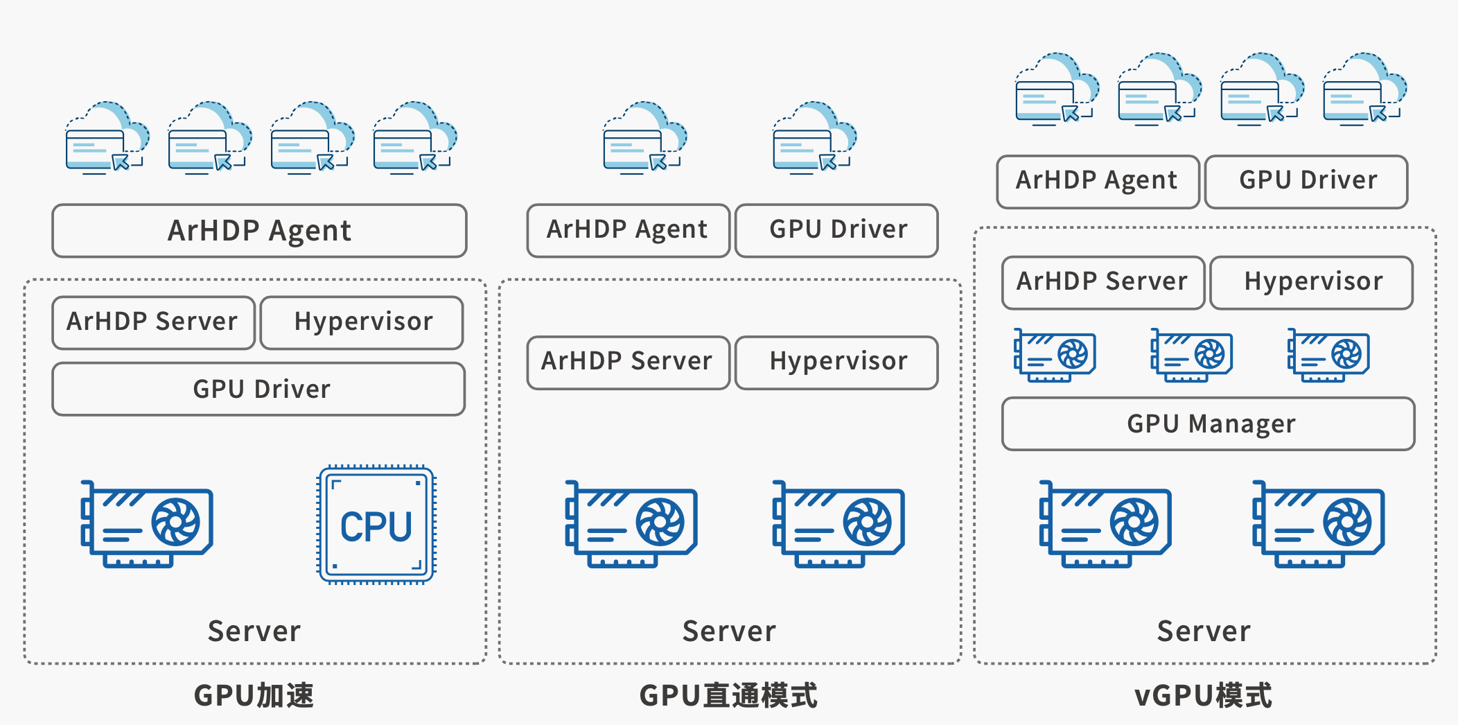 此外,ArHDP兼容多种GPU模式。在高密度并发场景下,通过GPU加速技术,可将桌面图像编转码能力转移到GPU上。降低CPU负载压力,提高办公场景下桌面的操作体验。为了能够满足3D软件的工作能力和效率,通过GPU直通技术,将物理GPU透传进桌面,由GPU完全负责对图像处理和视频的编、解码。同时,通过vGPU技术,将物理GPU 进行弹性切分,达到资源共享,灵活调用的目的,从而满足中、高级端3D设计场景极致体验。