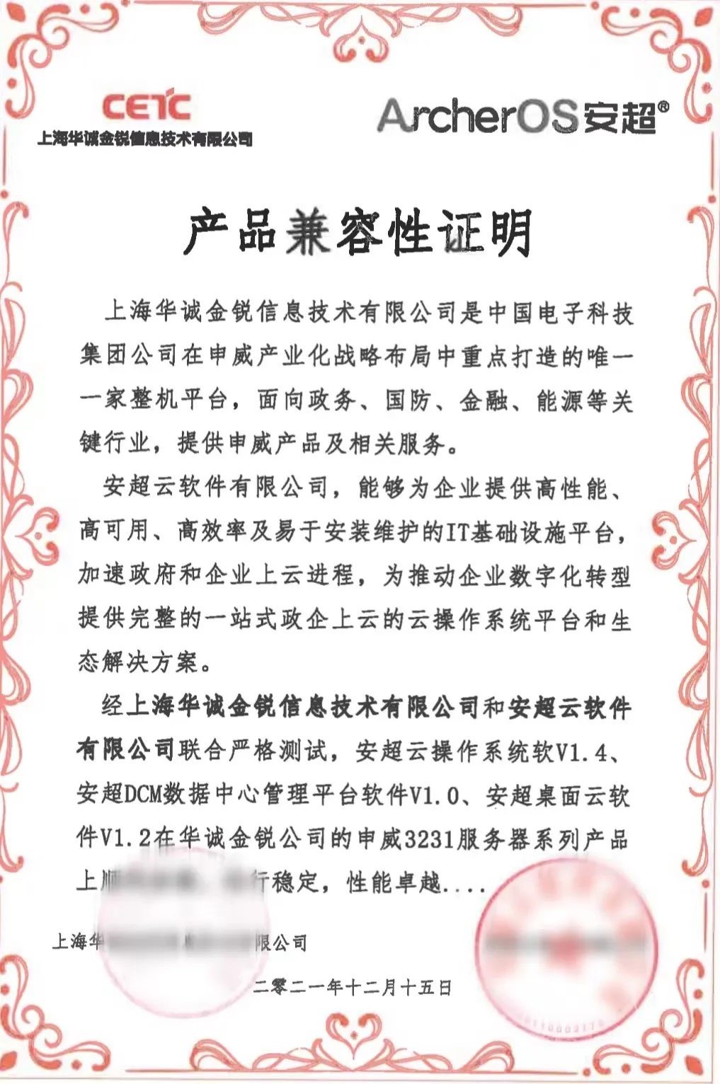 近日,安超云软件有限公司(以下简称:安超云)与上海华诚金锐信息技术有限公司(以下简称:华诚金锐)完成产品兼容性认证。测试结果表明:安超云旗下安超云操作系统软件、安超DCM数据中心管理平台软件和安超桌面云软件在华诚金锐的申威3231系列服务器产品上顺利安装、运行稳定、性能优异,能够满足用户的关键性应用需求。本次互认证,是对安超云产品、性能的肯定,也是为双方进一步合作奠定了良好基础。