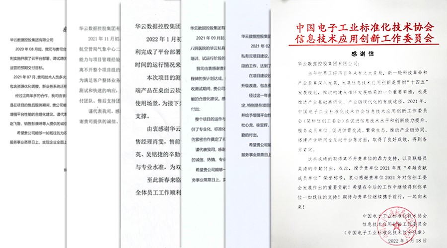 近日,华云数据收到了来自中国电子工业标准化技术协会信息技术应用创新工作委员会、新疆联盛科技有限公司、重庆海成实业(集团)有限公司、太极民航事业部、珠海圣澳云智科技有限公司、武汉攀升鼎承科技有限公司等行业权威机构、数字化转型客户代表及合作伙伴发来的一封封感谢信。