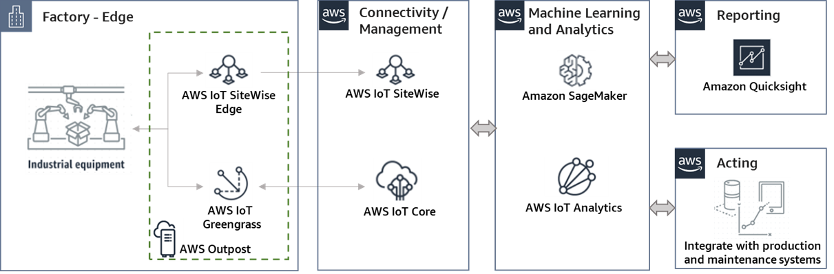 在工厂内部,亚马逊云科技边缘服务与工业设备(传感器、可编程逻辑控制器、数据采集与监视控制系统)通信,能够收集和分析数据、发送指令、运行本地应用程序。亚马逊云科技边缘服务使用连接/管理服务,使用加密通道与亚马逊云进行通信。