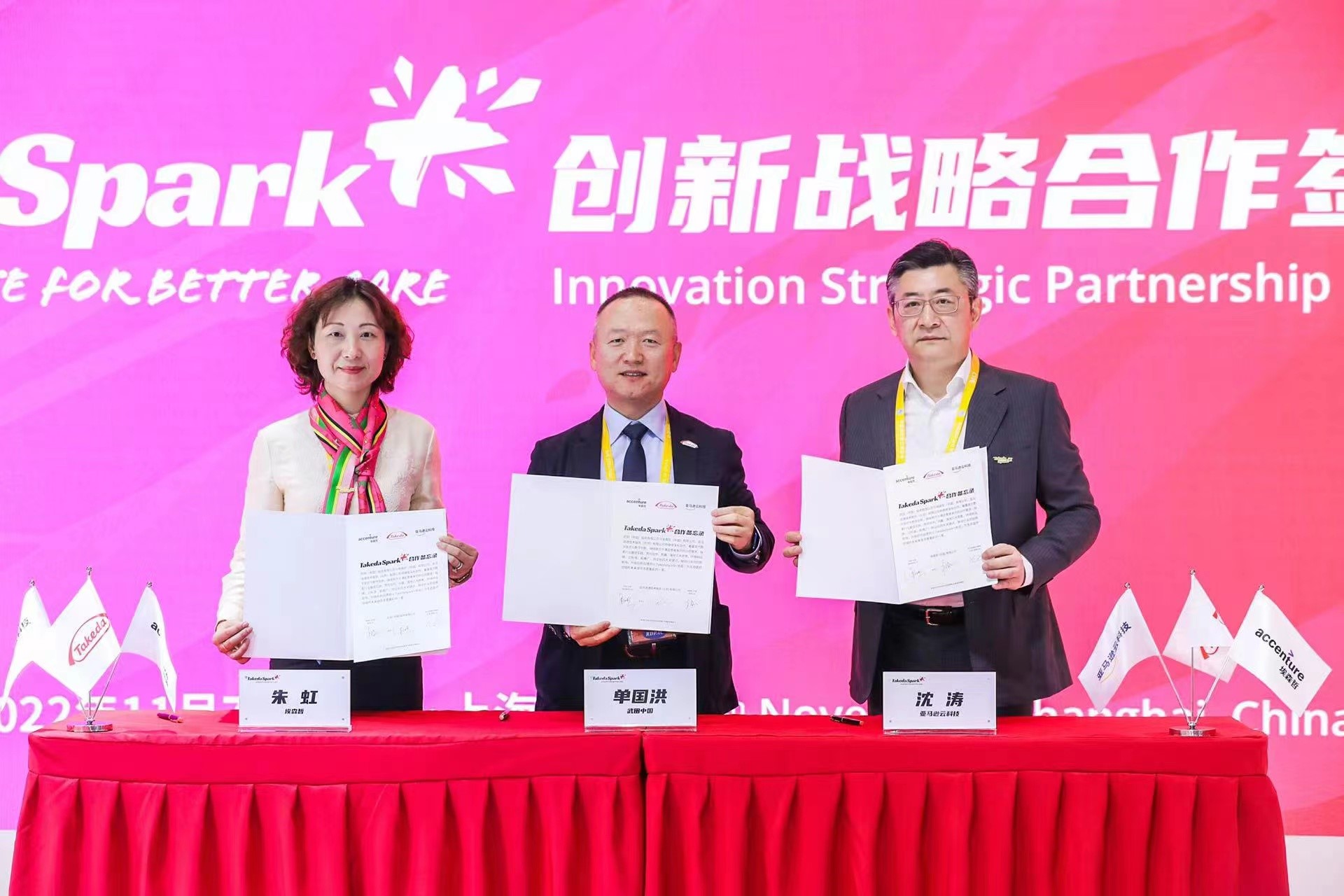 2022年11月9日 亚马逊云科技宣布,在第五届进博会期间,亚马逊云科技与武田(中国)投资有限公司(简称武田制药)、埃森哲(中国)有限公司(简称埃森哲)签署了创新战略合作协议,并共同启动 “TakedaSpark+” 2022年武田中国创新挑战赛。三方将通过创新挑战赛为“TakedaSpark+”招募、筛选具备突出科技创新能力和致力打造数字化健康解决方案的医疗创新企业。武田制药全球高级副总裁、武田中国总裁单国洪,武田中国数字化科技团队负责人顾青,亚马逊云科技中国区跨国企业及电信行业事业部总经理沈涛,埃森哲全球副总裁、大中华区主席朱虹共同出席了本次签约活动。