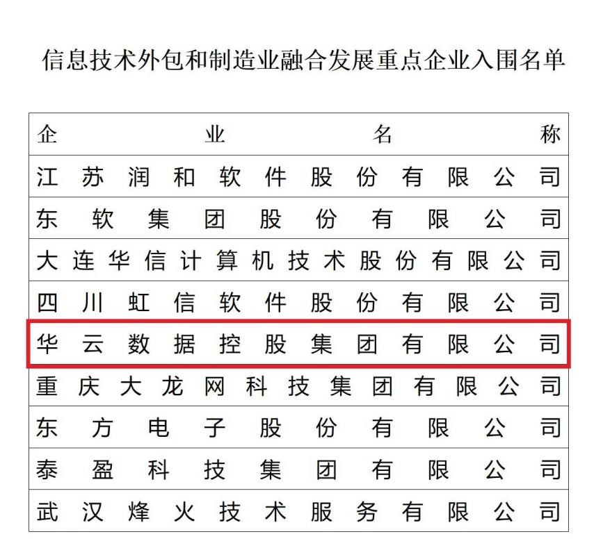 近日,根据《商务部办公厅 工业和信息化部办公厅关于组织申报信息技术外包和制造业融合发展重点企业的通知》(商办服贸函〔2021〕360号)要求,经省级商务、工业和信息化主管部门以及有关中央企业集团推荐及系列评审程序,信息技术外包和制造业融合发展重点企业入围名单正式公布。华云数据作为“信息技术类重点企业”实力上榜!