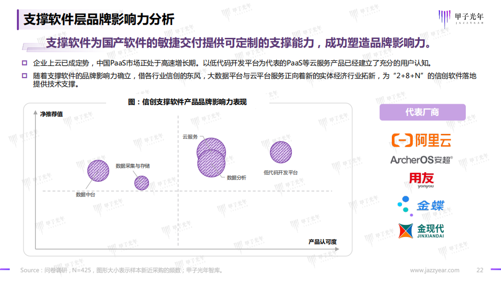 在本次报告中,甲子光年通过净推荐值、产品认可度方面评选出阿里云、用友、安超云等代表厂商,这些厂商的领先企业品牌影响力初具规模,推动企业“信创化”进程稳步发展。