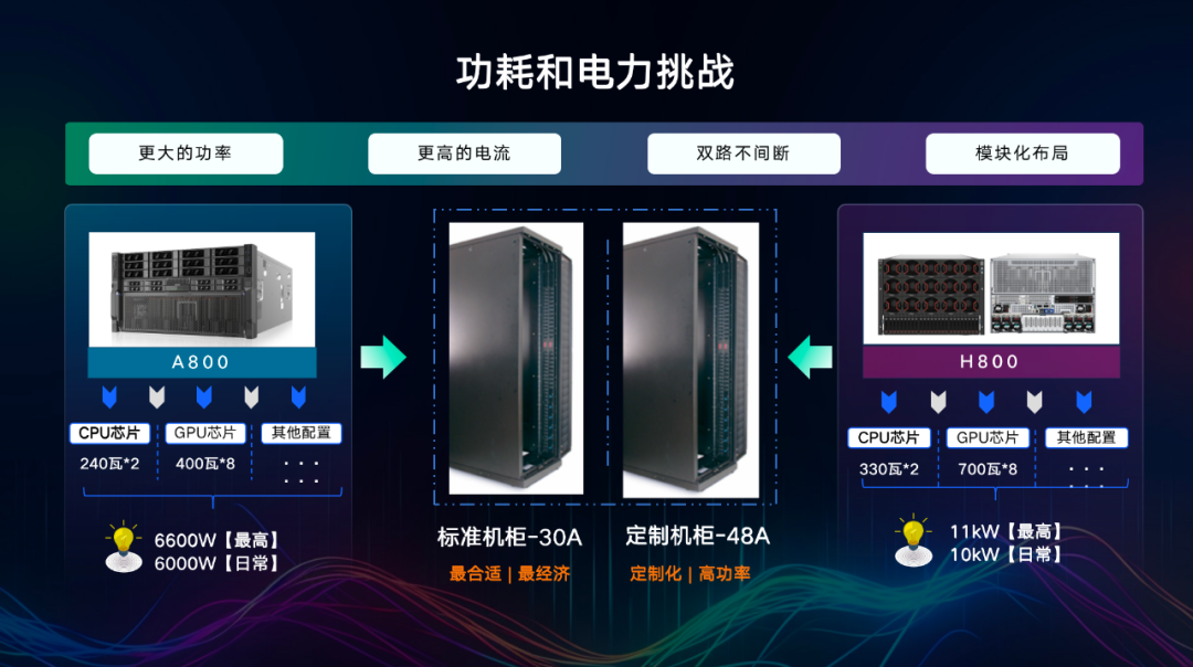 季昕华首先分享了大模型在功耗和电力方面的挑战,大模型所需的机房电量消耗大且功率更高。UCloud乌兰察布数据中心电力充分、电价低廉、可自然制冷且距离北京更近,具备高可靠性、高性价比等优势,可有效满足大模型的训练要求。相较上海、北京等同等质量的数据中心,成本下降40%;采用双路不间断电源供电,更加安全可靠;模块化的设计布局,支持机房模块、基础设施配置的深度灵活定制。