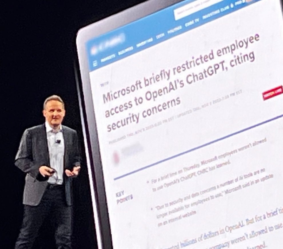 由此,许多企业首席信息官实际上禁止使用许多聊天工具。Adam Selipsky此时在大屏上放了一张微软禁用ChatGPT的新闻,台下哄堂大笑。