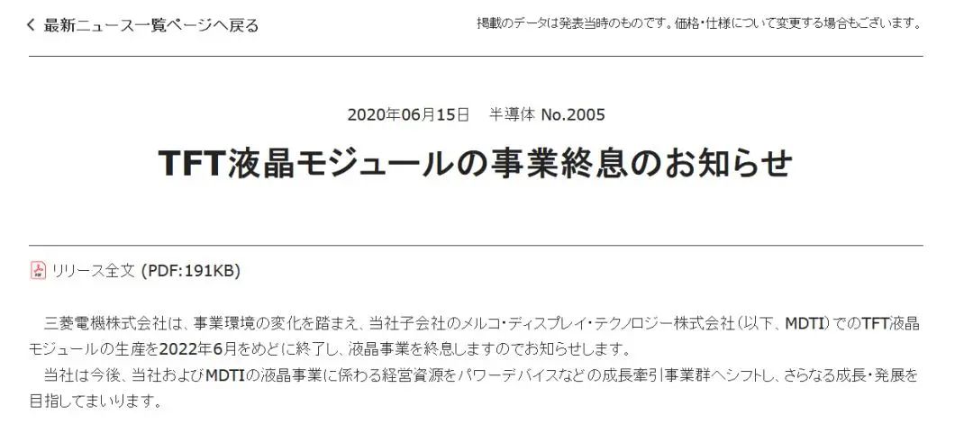 来自外媒的消息 ,三菱电机全资子公司Melco Display Technology Inc.(MDTI) 将于2022年6月结束TFT-LCD模组生产。确定将退出液晶面板生产的领域,进行法人清算破产程度,