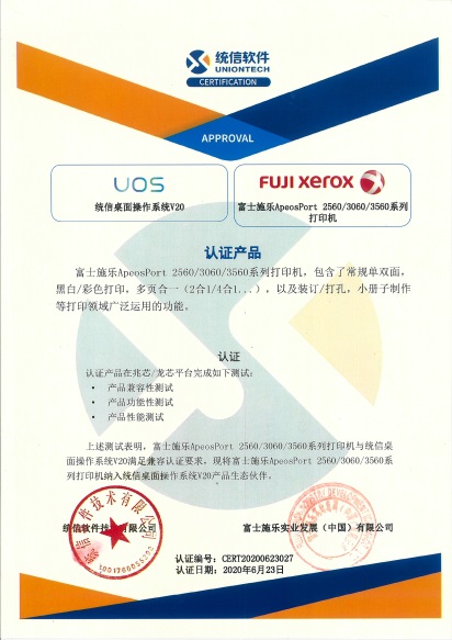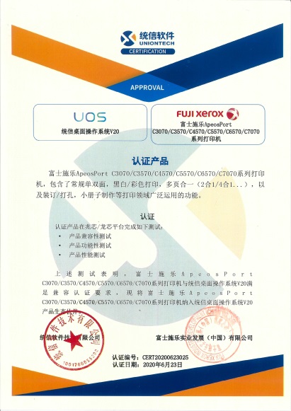 (2020年 7月23日,北京)今天,富士施乐(中国)有限公司宣布共70款机型获得国产操作系统统信UOS的兼容认证,其中包括新一代ApeosPort旗舰智能型数码多功能机、多功能一体机/打印机、生产型数字印刷系统。这是继获得中标麒麟、龙芯和兆芯兼容认证后,富士施乐产品获得的又一国产操作系统兼容认证,标志富士施乐(中国)全面支持IT国产化,积极推进全线产品与中国国产操作系统和中国芯产品兼容互认的又一有力举措。