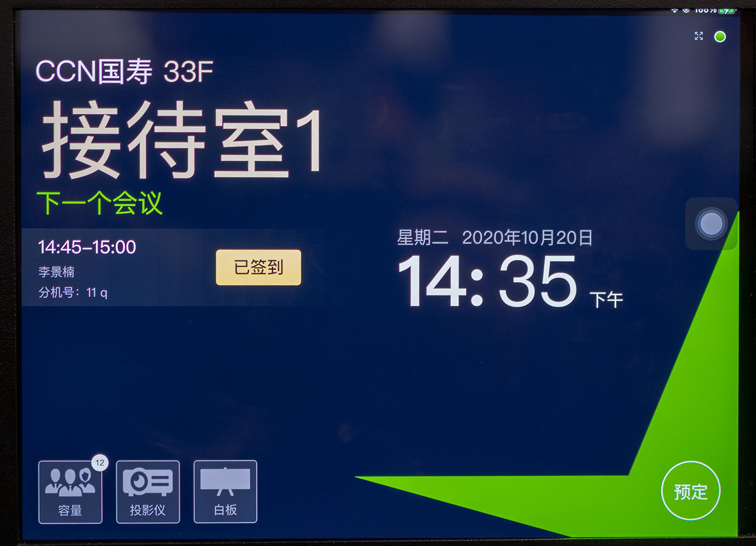 在会议室门口部署PAD,用户可以通过网页端和PAD端预定会议室,并收到确认的邮件通知。 PAD通过不同的颜色,直观显示会议室的使用状态,如空闲、使用中、待确认等。