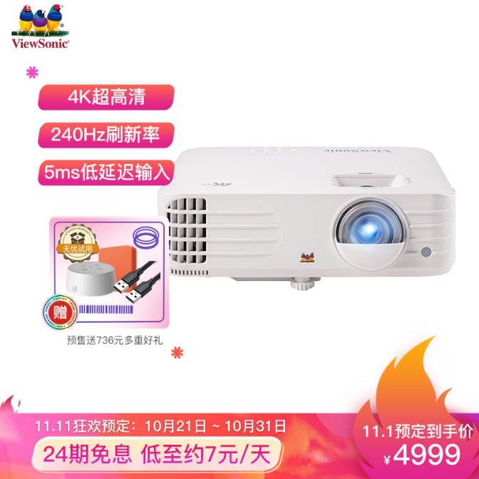 优派旗舰新品4K观影利器PX701-4K,兼顾大屏观影与电竞娱乐,已于10月21日开启首发预售!其搭载了8片纯玻璃4K光学玻璃镜头,投射画面可完整实现出830W像素;配置的HDR投影技术, 支持HDR10/HLG内容显示,为用户提供令人惊叹的沉浸式视觉效果;拥有240Hz超高刷新率和5ms输入延迟,将游戏体验提升到全新的水平;搭载3200流明高亮度,即使在高亮度场景,也能展现清晰艳丽的画面,同时拥有强大的曲面调节、四向画面校正技术(上下左右40度梯形校正)和自动垂直梯形功能,设置容易,轻松上手;配置的节能灯泡寿命长达20000小时,降低维护成本。预售活动期间限时直降700元,到手价4999元,还有白条24期免息福利,下单赠送智能电视盒子+叮咚音箱,晒单再送100元E卡。