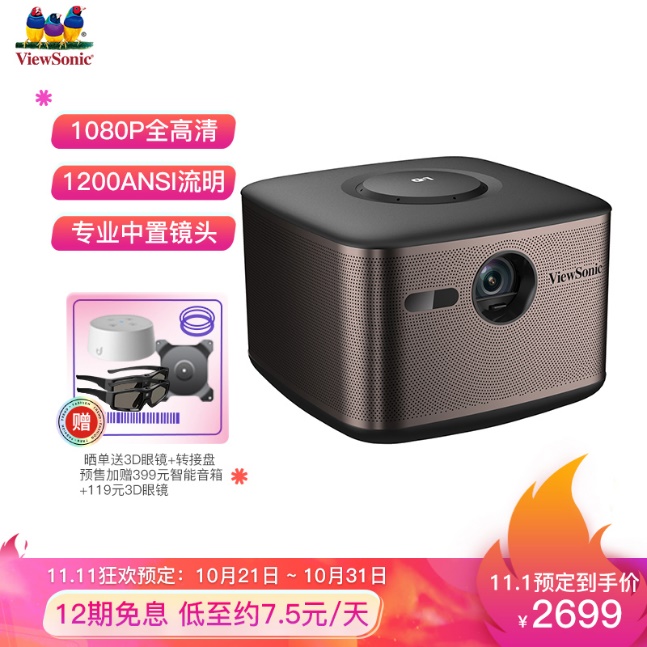 家用1080P智能投影机Q7+配置了球面玻璃镜片和专业投影机使用的中置镜头,方便用户整体调试;时尚纯金属机身外观设计,轻松融入家居客厅应用场景;拥有1.2:1的投射比,只需2.6米就可轻松投出百吋大屏;其沿袭了优派专业的SuperColor炫彩技术,来自优派专业色彩团队细心调校,瞬间将客厅化身电影院;在声音上,采用了密封大腔体设计,支持Dolby Audio音效,声音立体环绕;还有内置的智能系统和AI智能语音遥控功能,帮助用户轻松体验影院级的影音生活。预售到手价2699元,下单加赠价值399元叮咚音响,晒单还可享原装3D眼镜及吊架转接盘。