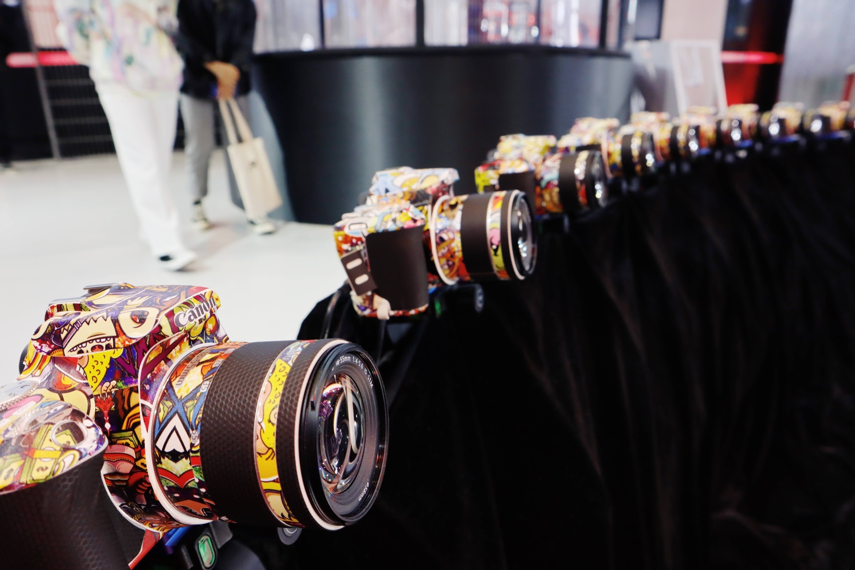 佳能展台内,多种艺术潮拍互动装置吸引大量观众排队体验。一辆以赛博朋克感的复古轿车为背景,由32台EOS 200 DII组成180度子弹时间的环拍区,引来了现场观众纷纷驻足打卡,环形相机阵将高速连拍照片串联,生成环绕式3D视频,搭配潮感十足视频外框,吸引了众多观众体验,32台相机均贴有创意涂鸦贴纸让装置区本身也成为全场吸睛亮点。