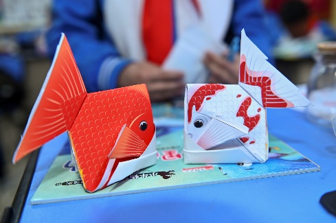 讲座之后就是学生们最爱的动手环节:手工制作课!课堂上学生们可以体验佳能 Creative Park1趣印乐园带来的海洋折纸。佳能趣印乐园里有许多海洋生物的素材,学生们最喜欢的还是这两条可爱的小金鱼,小金鱼折法不复杂,孩子们一学就会,玩的不亦乐乎。
