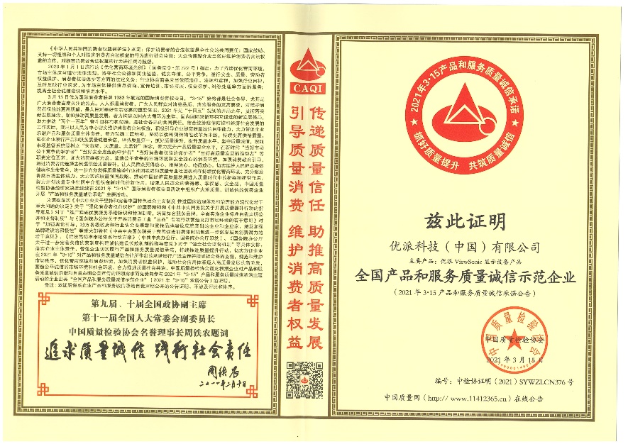 今年,质检协会再次携手2000余家全国产品和服务质量诚信示范企业组织开展产品和服务质量诚信承诺主题活动,引导企业主动发布产品和服务质量标准的自我声明,督促企业践行产品和服务质量诚信承诺,积极倡导提高供给质量,引领企业全面提升产品和服务质量,推动质量社会共治,优化营商环境,共筑质量诚信。确保产品和服务质量诚信是消费者放心消费的关键,也是品牌发展的重要保证,能够参与本次活动并获得相关荣誉证书,不仅是对优派过硬产品质量的充分肯定,也体现了国家和公众对优派品牌信誉的一致赞许与认可,激励着优派继续秉持以客户体验为中心的理念,继续在追求专业与一流品质的路上不断永攀高峰,为消费者提供更加优质的产品和服务,为视讯行业树立一个崭新的标杆!