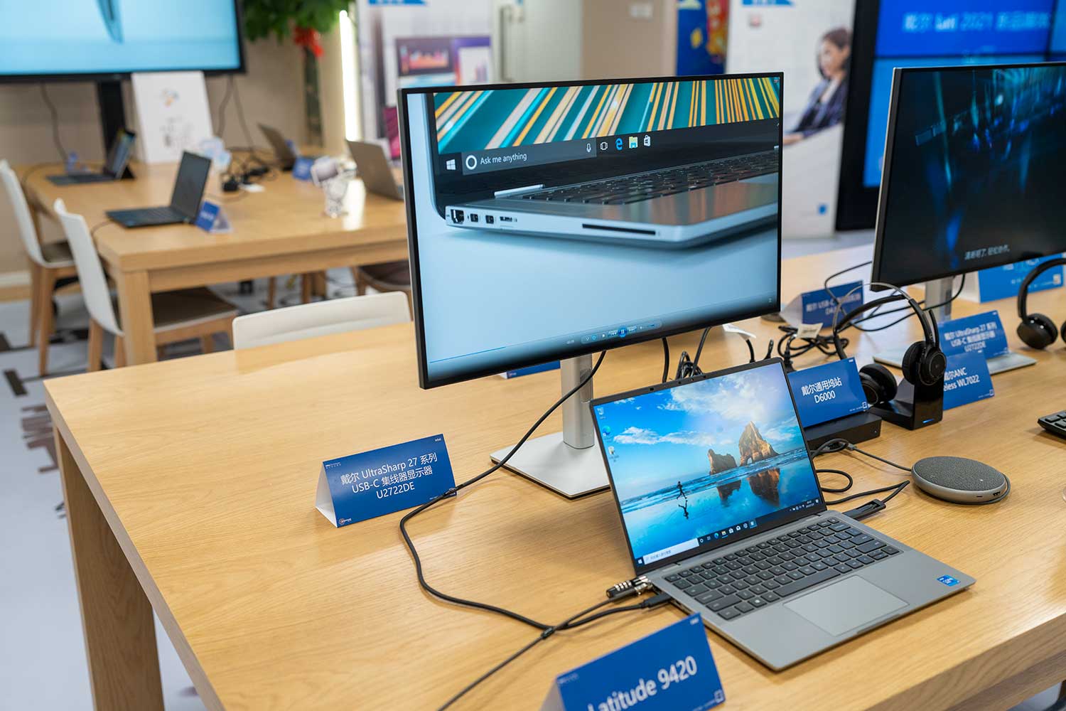 在会议场景中,配备了戴尔Latitude 3、5、7、9000不同系列的笔记本电脑,针对会议需求定制的戴尔55英寸4K会议显示器C5519Q、Apollo全指向麦克风扬声器,会议室中的员工借助这套设备,可与现场的团队和远程加入的同事们畅聊自己对新项目的构想。而居家办公体验区中,一台Latitude 7320二合一可翻转笔记本,搭配扩展坞WD19S即可有序连接34英寸的曲面会议显示器C3422WE、智能4K网络摄像头WB7022、无线耳机WL5022,即组成一套舒适的居家办公生态,用户居家办公也能享有大屏视野、畅快链接,沉浸式协作体验。