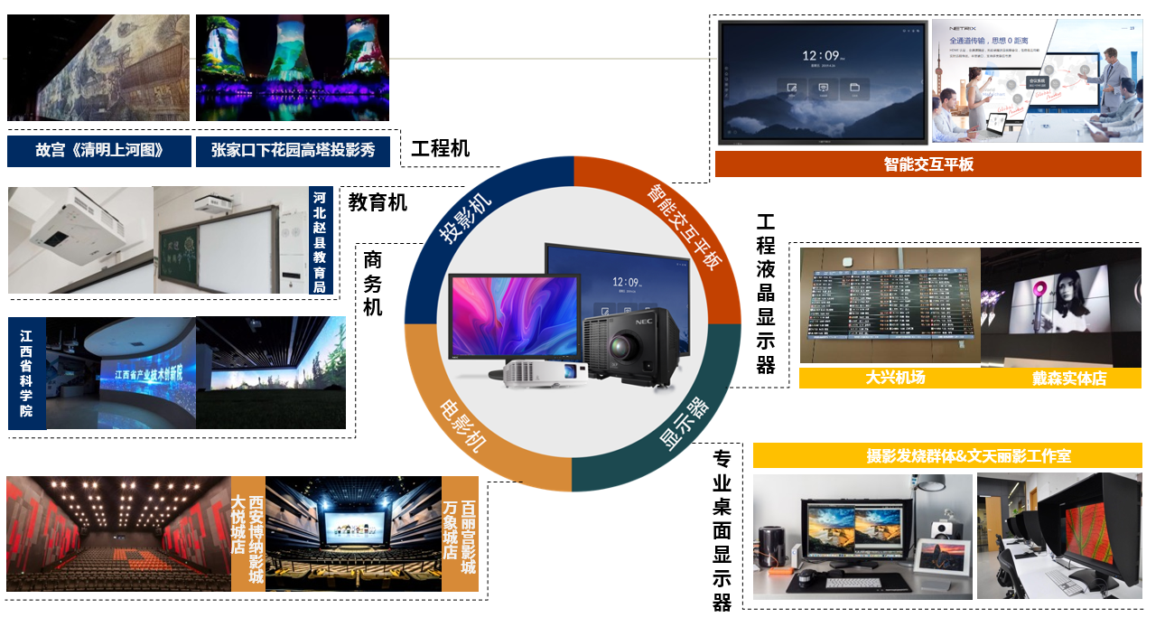 NEC显示产品在商显领域深耕40余年,依托强大的技术积淀、不断创新的精神和丰富的渠道资源,在全球投影市场业绩长期保持领先。NEC投影机拥有超全产品线,广泛覆盖工程、泛工程、商教领域,横跨LCD和DLP两大主流显示技术,全面覆盖3LCD、3DLP、DLP,同时涵盖单色激光、双色激光和HLD新光源,并灵活地与不同显示技术的产品相结合。2020年,疫情对显示行业造成巨大冲击,面对挑战,NEC积极拥抱变化、进行前瞻性布局,推出多款重磅新品:多场景应用全能手骑士系列、英雄系列双色激光工程投影机、哈勃系列液晶激光投影机及极光系列激光投影机等,在展览展示、户外亮化、文化旅游、舞台演出、社会娱乐、商务会议等多领域打造了一系列标杆案例,成功塑造多款爆款产品。正因如此,NEC商用投影机2020年在中国市场取得了排名第三的优异成绩。