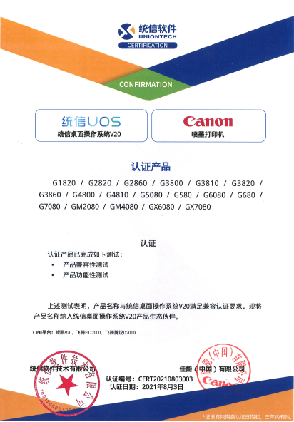 8月初,佳能(中国)有限公司(以下简称:佳能)宣布,旗下60款商用喷墨打印机产品完成与统信UOS操作系统的认证工作。通过此次系统认证的达成,佳能喷墨打印机携手统信UOS操作系统,将进一步满足国内用户的新型需求,推动国内信创产业发展。