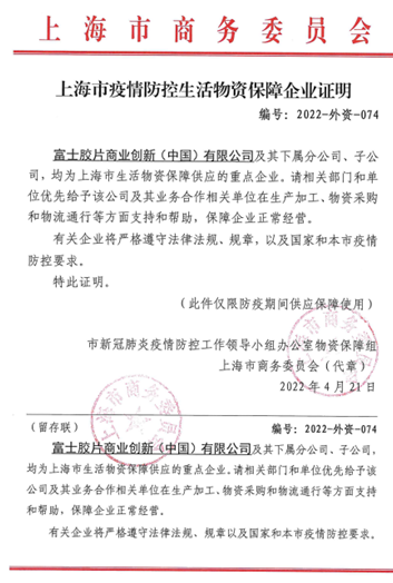日前,富士胶片商业创新(中国)有限公司【原富士施乐(中国)有限公司】及其下属分公司、子公司获得上海市商务委员会出具的上海市疫情防控生活物资保障企业证明。富士胶片商业创新(中国)位于上海的多处物流中心已恢复出库发货,持续为全国客户提供装机、零部件及耗材供应,确保不间断服务。富士胶片商业创新(中国)是行业首家被上海市商务委员会认定的保供重点企业。