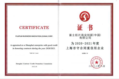 近日,上海市合同信用促进会公布了“2020至2021年度上海市守合同重信用企业”名单。富士胶片商业创新(中国)有限公司【原富士施乐(中国)有限公司】与富士胶片实业发展(上海)有限公司【原富士施乐实业发展(中国)有限公司】凭借良好的企业信誉和行业公信力,获评“上海市守合同重信用企业”,并被认定为最高级别AAA级合同信用等级企业。这是继富士胶片实业发展(上海)有限公司等三家企业获“2018至2019年度上海市守合同重信用企业”称号后,富士胶片商业创新在华企业再次荣获该荣誉。