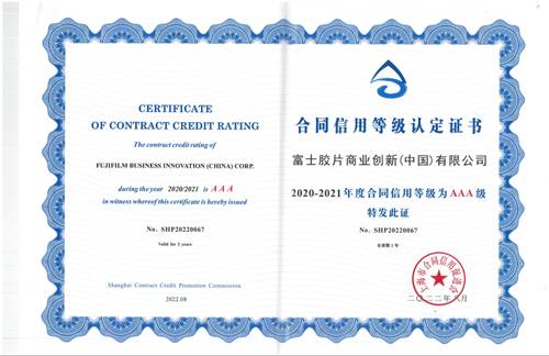 长期以来,富士胶片商业创新在华企业坚持以客户为中心、诚信经营,同时致力于成为客户在推动业务创新方面值得信赖的合作伙伴。此前,富士胶片商业创新(中国)连续多年荣获“全国质量诚信标杆企业”、“全国质量信用先进企业”以及“全国产品和服务质量诚信示范企业”等荣誉。此次荣获“上海市守合同重信用企业”AAA级荣誉,是对富士胶片商业创新在华企业长期诚信经营的高度认可。