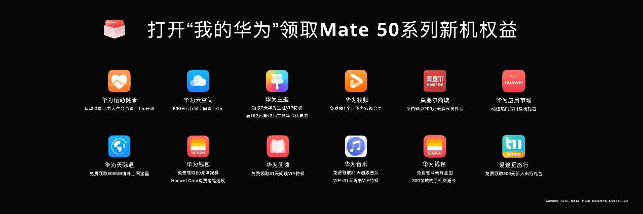 此次HUAWEI Mate50系列还为新机用户带来重磅权益礼包,包括华为云空间50GB云存储空间0元、华为主题免费7天主题VIP特权与年卡优惠券、华为视频免费1个月华为影视会员、华为钱包免费60元满减券与Huawei Card消费笔笔返现、华为阅读免费领取31VIP特权、华为音乐免费31天超级音乐VIP与听书VIP、华为天际通免费500MB境外上网流量等,打开“我的华为”App,点击新机权益即刻领取,多重优惠享不停。