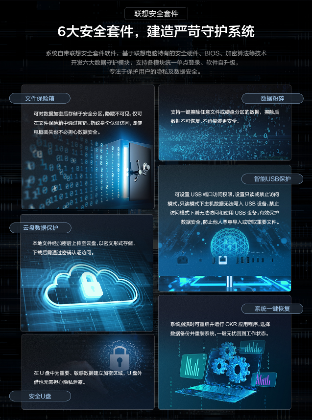 针对从事数据处理的商务人士对于数据安全的实际需求,ThinkCentre neo S760自带6大联想安全套件,基于联想电脑特有的安全硬件、BIOS、加密算法等技术开发六大数据守护模块,支持各模块统一单点登录、软件自升级,专注于保护用户的隐私及数据安全。
