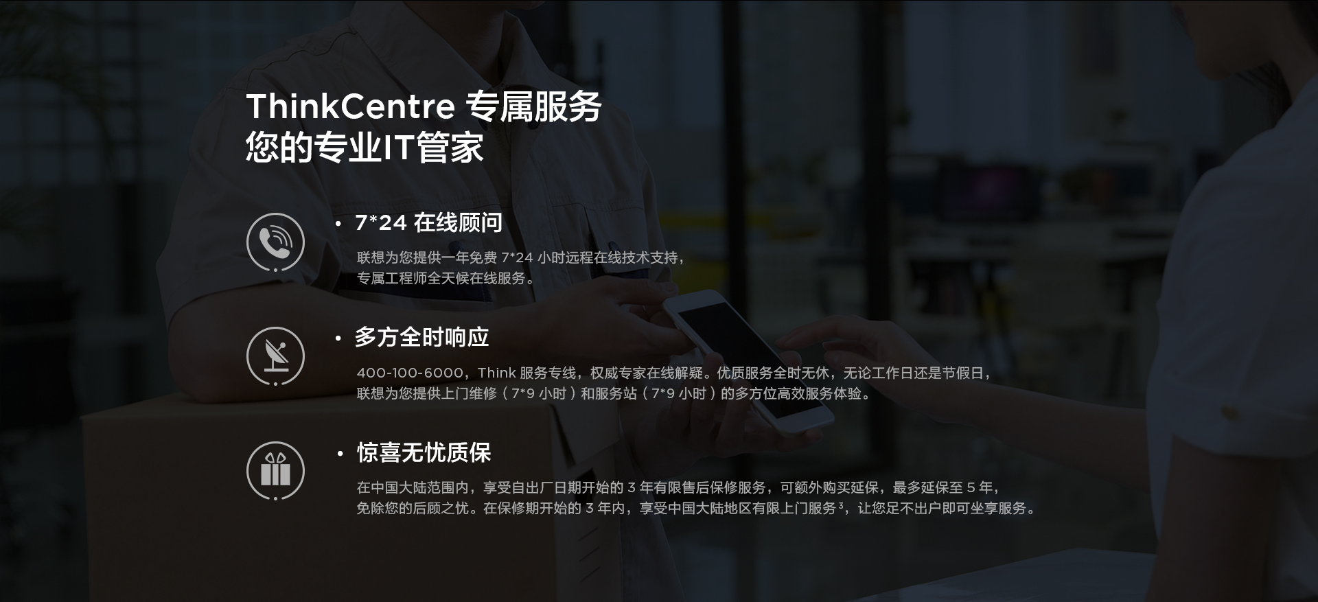作为面向商务用户推出的一体机产品,考虑到企业和用户的维保需求,在售后服务方面,ThinkCentre neo S760为用户提供长达3年的整机保修和上门服务,可额外购买延保,最多延保至5年。以及一年免费7*24小时远程在线技术支持,Think服务电话专线权威专家在线解疑。优质服务全时无休,无论工作日还是节假日,为用户提供上门维修(7*9小时)和服务站(7*9小时)的多方位高效服务体验,保证售后无忧。