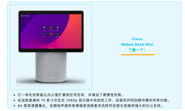 Cisco Webex Desk Mini一体化优势能让办公室扩展到任何空间,并增加了便携性优势。在这款紧凑的 15 英寸交互式1080p 显示器中找到您工作、会面和共同创建所需的所有功能。64 度高清摄像头、全频扬声器和背景噪音消除麦克风阵列全程为您提供强大的办公支持。