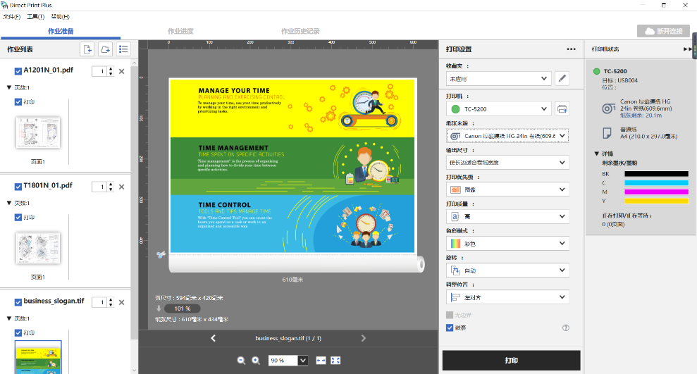 imagePROGRAF TC-5200支持多种打印应用方案和设备管理方案,图纸输出时可采用免费赠送的Direct Print Plus应用方案:多种类型的文件可直接进行拖拽式打印,无需打开文件应用程序来选定纸张来源和尺寸大小,让打印小白也能没有压力地实现多种格式和尺寸的打印输出。此外,采用Canon Print Inkjet/SELPHY软件应用方案,用户通过手机、平板电脑等智能移动终端就可以完成打印、复印、耗材余量确认、固件升级等操作,摆脱传统电脑台式机的操作束缚,让办公更轻松。