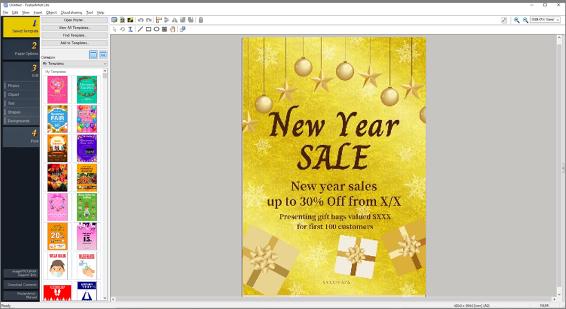 针对于餐厅、酒店、零售店等使用场景,imagePROGRAF TC-5200还支持Poster Artist Lite软件应用方案,用户可以轻松制作海报和传单。Poster Artist Lite提供种类繁多的模板,让用户可以根据自己的需要选择素材,随心编辑文字和图片,即使非专业人士也能轻松进行设计创作。在即将发布的V3.5版本中,还增加了拥有金色/银色纹理效果的模板,更加契合中国市场用户的使用习惯。