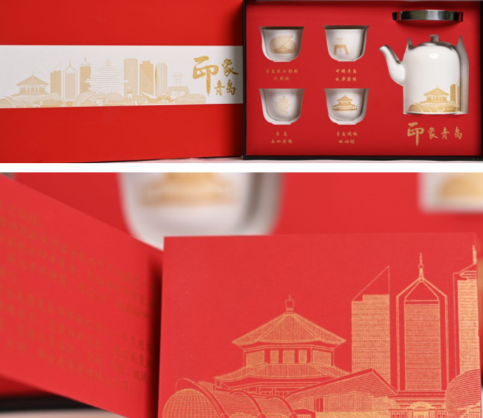 结合时下消费者的审美,青岛朗印数字印刷有限公司根据地方特色原创设计了一款骨瓷茶具礼盒文创产品:通过专色金转印,将全青岛地标建筑全部勾画到骨瓷茶具上。
