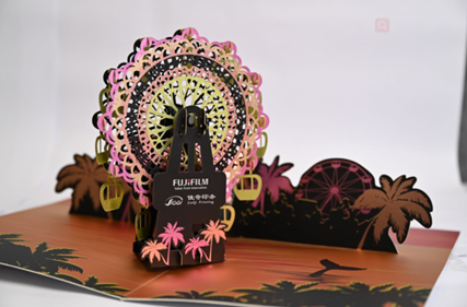 “作品将创意设计和6色设备的技术特点多重运用相结合,不仅让产品形式和内容都动了起来,也让设计师好的创意通过6色设备得到完美实现。”枯木(仝亚男)表示,该摩天轮产品不仅适用于各种活动现场和婚庆典礼等,也能让客户了解更多关于纸张、异形模切的信息和Revoria PressTM PC1120的诸多独有优势,带来可观效益和更多商机。