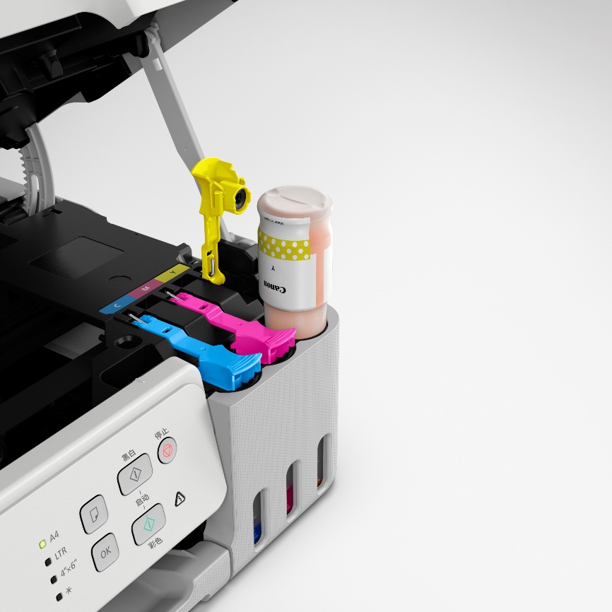 另外,机身正面还加入了墨水窗口,各颜色的墨水余量一目了然,方面用户随时查看耗材的使用情况。G系列新品同样支持用户自行更换保养墨盒(MC-G04),操作简便,减少维修需求,延长使用时间。在注墨过程中,新增的弹簧式墨水盖易于抬起,注墨时无需手扶瓶盖,墨水加满后自动停止,不脏手,更轻松。差异化的卡口配合无需按压的注墨设计,能够避免注墨脏手及错误注墨的烦恼,对于新手用户也更加友善。
