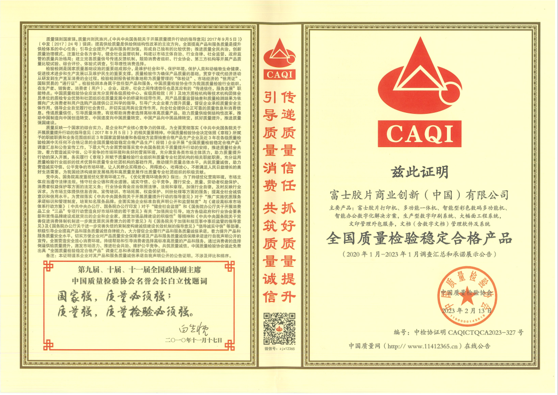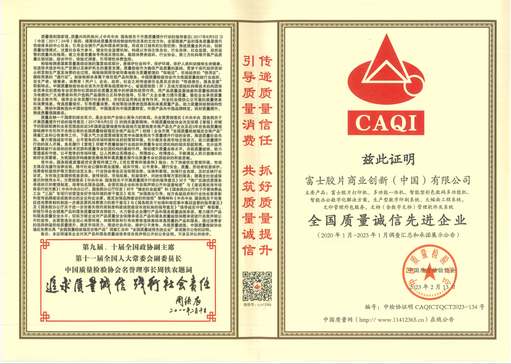 (2023年3月20日,北京)近日,在中国质量检验协会主办的“‘3.15’国际消费者权益日‘产品和服务质量诚信承诺’”主题活动及系列评选中,富士胶片商业创新(中国)有限公司再次荣获“全国质量诚信先进企业”称号,其系列产品获评“全国质量检验稳定合格产品”。这是对富士胶片商业创新(中国)长期诚信经营、产品稳定可靠、服务专业的高度认可。