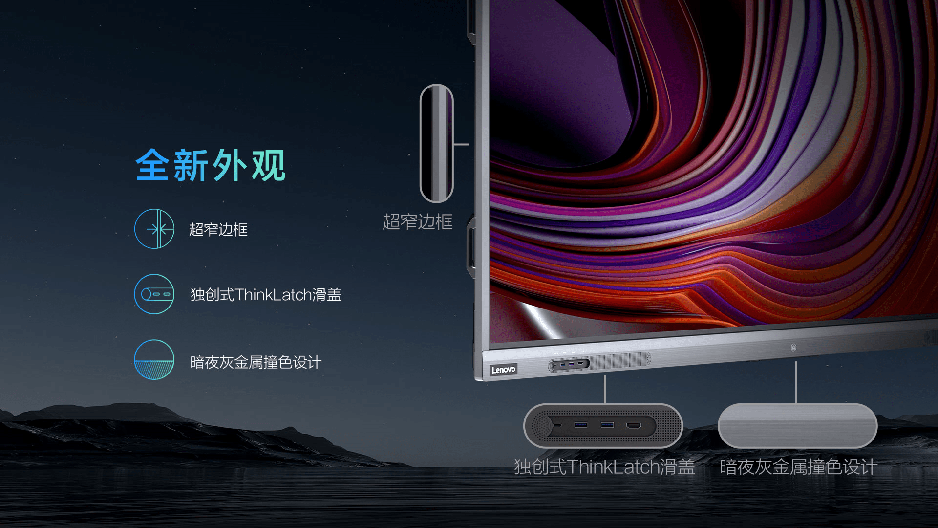 此外,为方便会议中随时面临的扩展需求,机身左下方不但配置了多枚前置接口,更通过独创的ThinkLatch滑动式接口盖板进行保护,有效防尘、防磕碰,整机外观将时尚感与科技美感兼容并蓄。