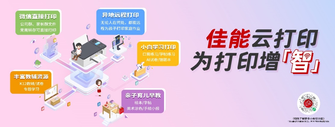 在网络连接方面, 4款新品均支持5GHz或2.4GHz的Wi-Fi连接,让用户享受稳定高速的无线连接体验。此外,为了给用户提供更丰富多彩的打印体验,“佳能云打印”小程序,在不需要安装电脑驱动的情况下, 只要能上网,无论身在何方,都可以通过佳能云打印小程序,远程控制已连接Wi-Fi的佳能打印机,直接打印文档和照片。用户可以实现异地远程打印,也可以在云打印小程序中挑选喜爱的素材,配合佳能打印机支持多种介质的特性,打印各种折纸、贴纸、打印春联用的1.2米长纸等来完成学校布置的手工作业,轻松享受亲子互动时光。此外,用户也可以通过访问“佳能打印宝典”小程序了解更多佳能打印机相关的讯息。