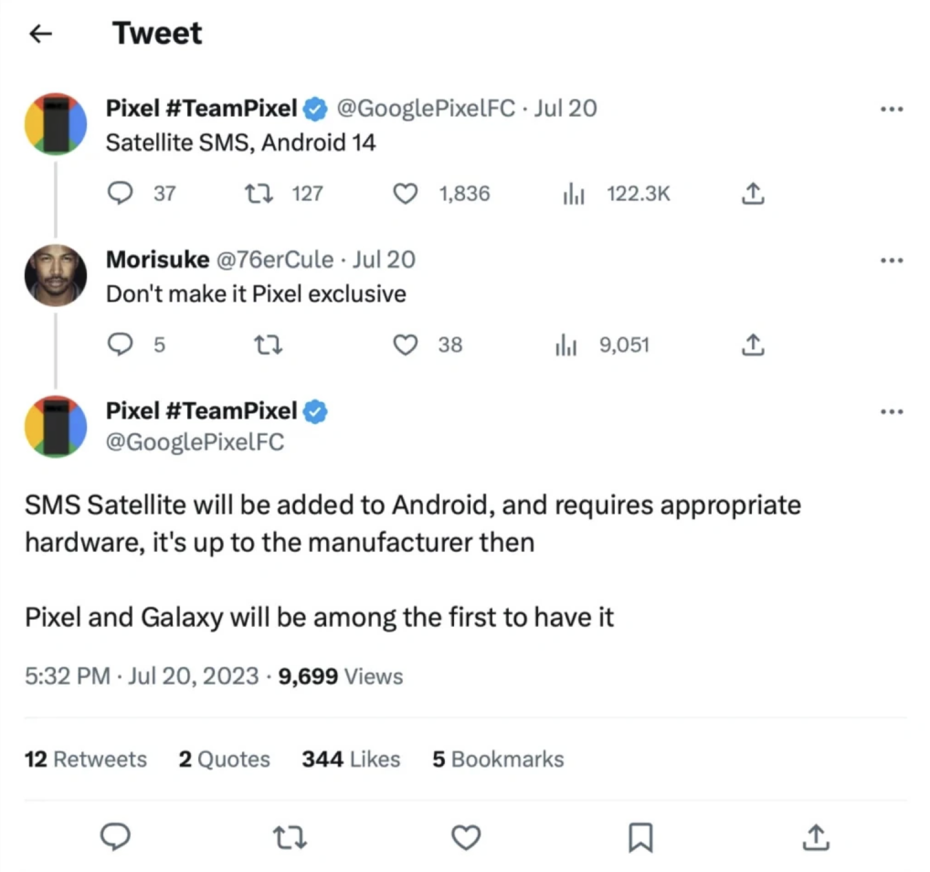目前这一功能被表示将加入安卓系统而非谷歌亲儿子的Pixel手机独享,所有使用安卓14的手机都可能实现卫星通讯功能,不过最初只有谷歌与三星可以享受这一待遇。