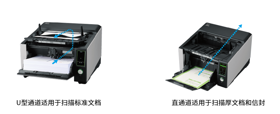 新增的“直通道扫描”功能可扫描厚达1.25 mm 且不可弯折的文档,如卡片纸或硬质信封,将文档输送到扫描仪背部。此外,新机型沿用了前代畅销款采用的“手动进纸”模式,可扫描对折文档和多联票据。