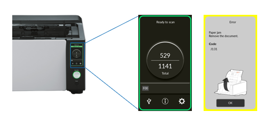 超大触摸屏一目了然,支持扫描仪状态检查等直观操作。该触摸屏显示的错误提示包含图示,帮助用户顺利处理错误。