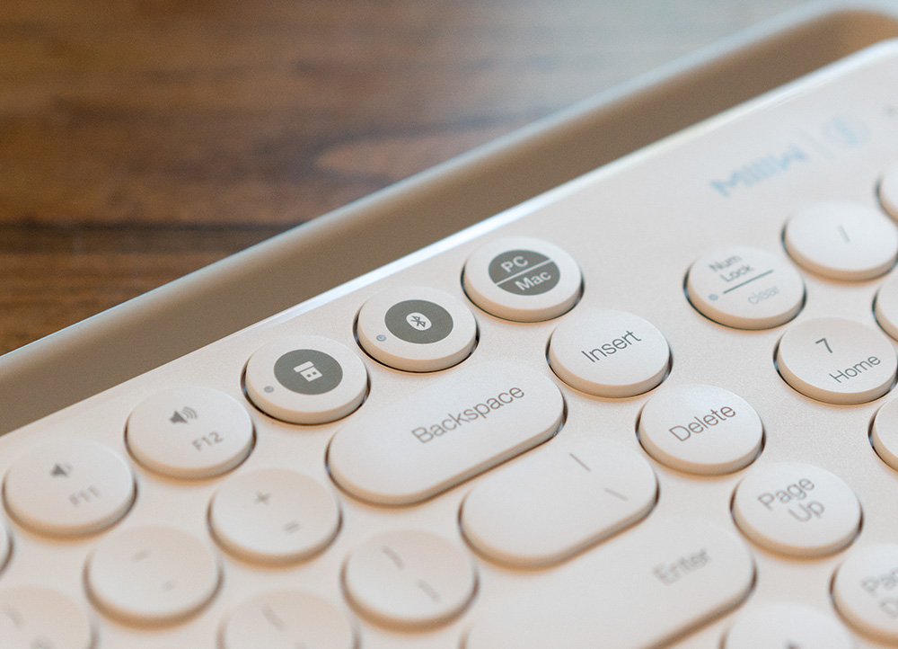 在连接切换按键边上还有一个PC/MAC切换的按键,这里可以在键盘的WINDOWS键和MAC的花键之间进行快速切换,看一这一设计的时候,小骗认为这真是太贴心了。用过不同系统的人肯定对双系统下这两个功能按键位置的不同步,在使用的时候造成了很多的问题,而米物这款键盘通过一个简单的功能切换按键,让用户可以随自己的喜欢来切换这个重要的功能按键在什么位置,真的是为用户考虑到了极致,当然如果可以再加上屏蔽这具按键的功能就更完美了。