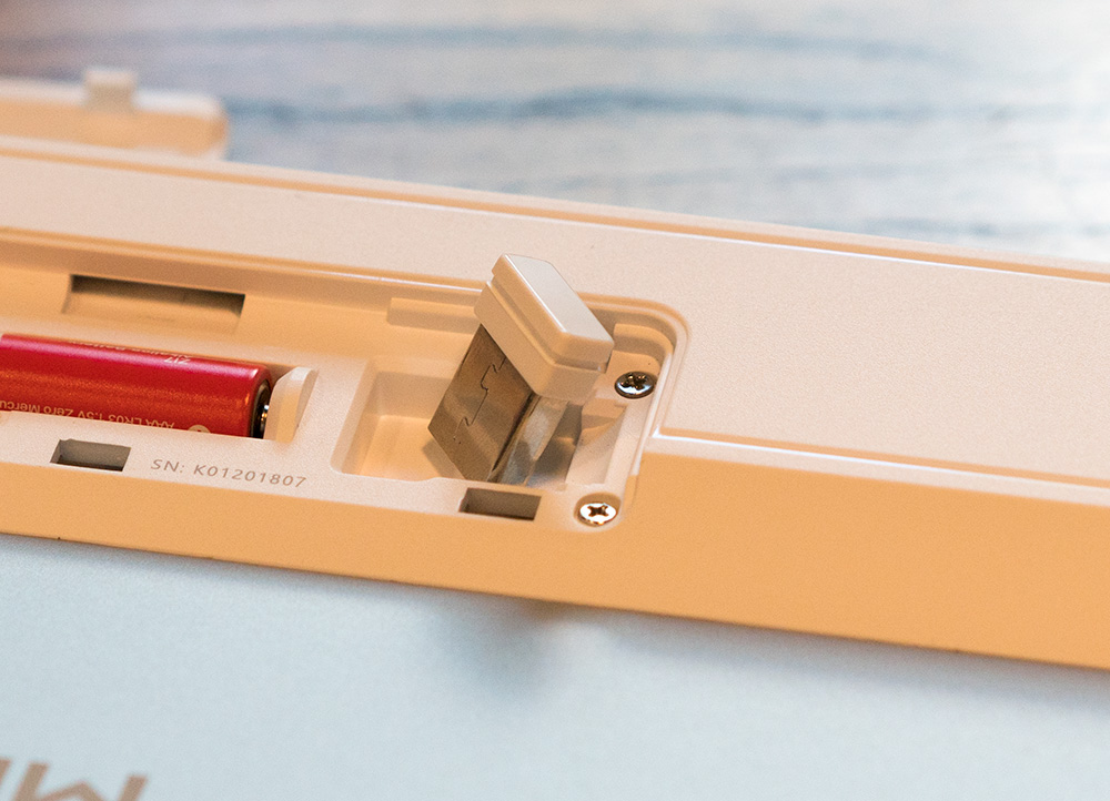 键盘背部采用了一整块金属板材,据说为了配重,在远端的一侧还加入了一块合金条平衡支架重量。除此之外电池仓和键盘支架被设计在了一起,为键盘提供了一个6度的支撑,在电池仓我们可以找到一个带有磁性的2.4G无线接头收纳位,这样用户在需要用到2.4G的时候就不用担心本件丢失的问题,非常贴心。