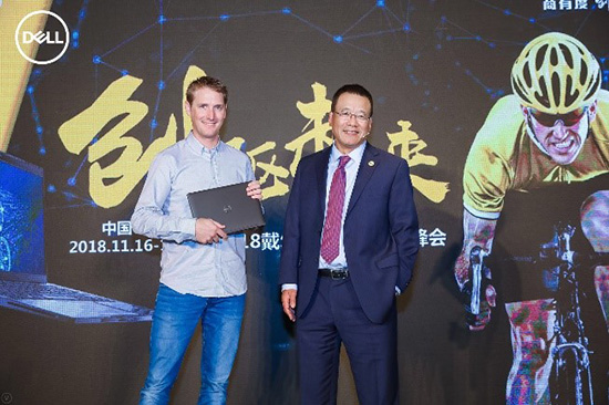 环法冠军车手安迪 施莱克接受戴尔科技集团全球执行副总裁、大中华区总裁黄陈宏博士致赠戴尔Latitude笔记本电脑