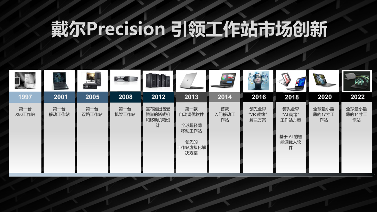 第一个阶段,探路的前十年。1997年戴尔发布了第一台基于Intel和Windows的Precision工作站;2001年推出戴尔首台移动工作站;2005年推出双核工作站;2008年推出戴尔第一台机架式工作站,为消费者提供新选择。