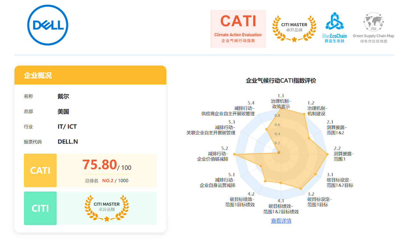 金秋季节,一年一度的绿色供应链指数CITI(The Green Supply Chain Corporate Information Transparency Index)和企业气候行动指数CATI(The Corporate Climate Action Transparency Index)大会于2022年11月3日在北京隆重举行,来自全球多个国家的26个品牌通过线上线下的形式积极参与。今年,戴尔科技集团连续第三年荣获CITI绿色供应链卓异品牌称号,连续两年跻身CATI企业气候行动榜前三甲,排名第二。