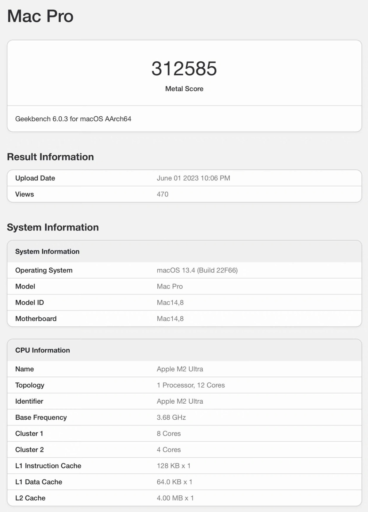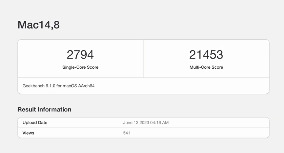 继搭载 M2 Ultra 的 Mac Studio(Mac14,14)现身 GeekBench 跑分库之后,搭载相同芯片的 Mac Pro(Mac14,8)的跑分也同时曝光。
