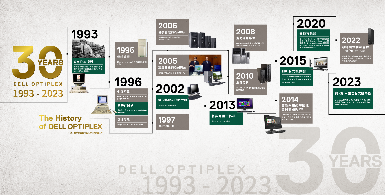1993年,第一台戴尔OptiPlex商用台式机诞生,它可能是很多人的第一台工作PC,陪伴着我们,慢慢走过30年时光。在这30年里,OptiPlex伴着数不尽的用户一同经历着时代的发展和变迁,也见证了每一位用户滴水穿石的努力和获得的辉煌。