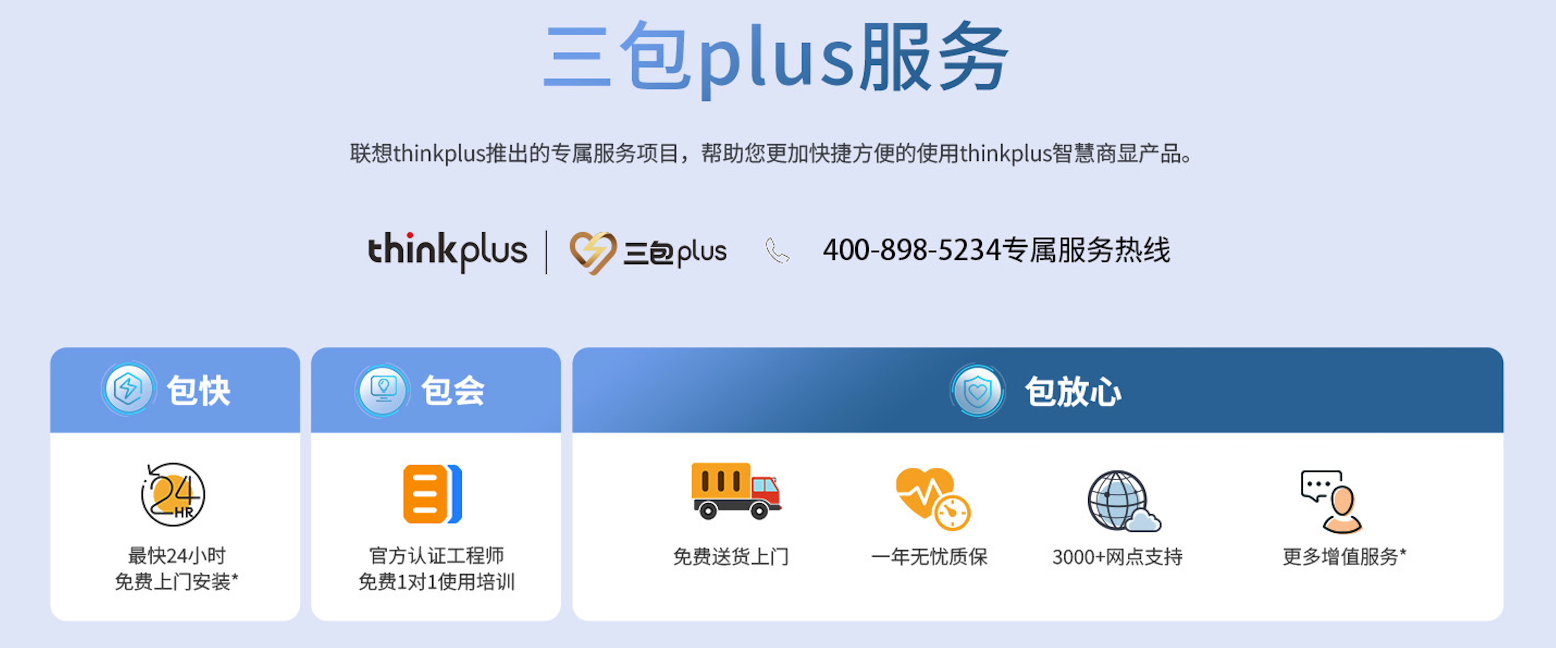 除了为企业提供软硬件方案之外,联想的服务质量在业内也首屈一指。作为一栈式混合办公全场景方案的关键一环,联想thinkplus在本次展会上带来了全新升级的“三包plus服务”,并提出“包快、包会、包放心”的“新三包”服务体验承诺。包快,大幅缩短了从用户发起安装需求到上门服务的平均时间,由27个小时缩短至15个小时;包会,联想在全国主要城市配置专业工程师,提供一对一上门培训和咨询,帮助用户快速上手;包放心,在一年质保、免费上门安装之外,联想将提供延长保修、5*8小时在线答疑直播间等增值服务,让客户买得放心,用得舒心。此外,联想thinkplus还推出了全新的“三包plus小程序”,相比传统的致电服务方式,微信小程序能让用户更快接入联想服务,随时了解所处服务阶段,实现服务流程的可视化。
