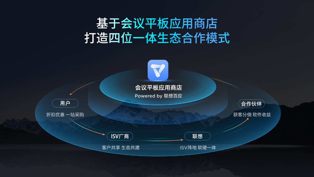 凭借联想thinkplus在商显领域的软硬件产品和服务领先优势,以及ISV合作伙伴的逐渐丰富,联想thinkplus基于联想百应平台打造出全新的“会议平板应用商店”,致力于构建 “联想、合作伙伴、ISV厂商、用户”共赢的四维生态。用户不仅可以通过应用商店以相对优惠的价格,按需下载适配会议平板的软件App;合作伙伴也能通过软件销售,带来硬件和运维之外更多的收益;ISV厂商可将其打造成触达商显用户的核心阵地,实现从预装、推荐到认证等更多商机;联想希望借此完成自身业务模式的重要迭代,打造商显领域的新生态。
