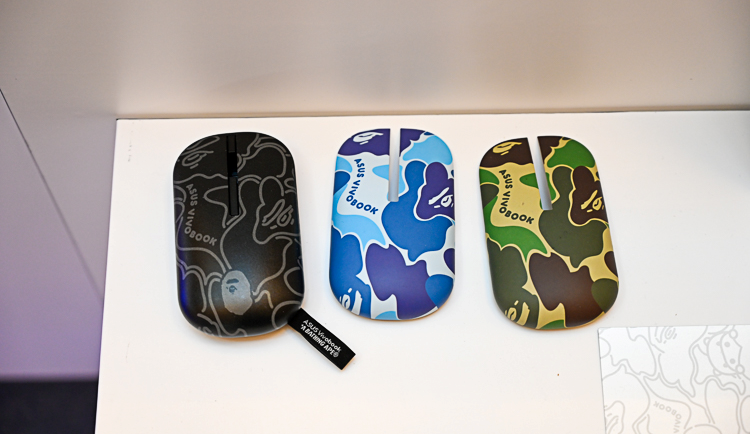 礼盒中,华硕无畏还附赠了一款采用水转印手工制造工艺、具有BAPE视觉迷彩的无线鼠标,尾部具备专属的织带设计,鼠标顶盖可进行更换。