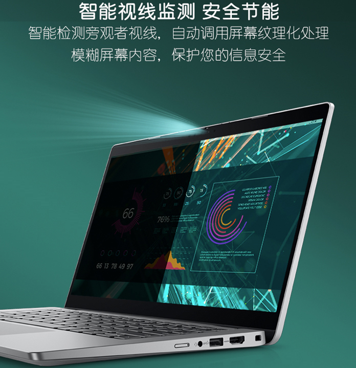 而在个人隐私方面,除了基于近距离传感器和IR摄像头的用户智能感知智能应用Express Sign-In(用户离开自动息屏锁定,返回后自动亮屏,并结合IR人脸识别自动登录系统,回到离开前的工作状态),Latitude 5X40还提供两个较新的功能:防窥保护和用户视线检测。当有其他人窥视用户屏幕时,笔记本会自动进入马赛克状态保护隐私且同时提醒用户;而当用户视线没有专注在屏幕上(比如在看手机),屏幕则会自动变暗,不仅保护隐私,还能有效节能,提升续航。
