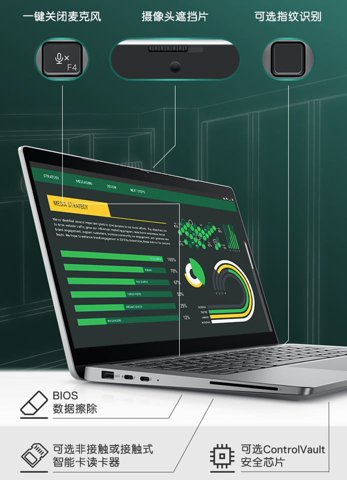 实际上,Latitude 5X40的安全特性可不止上面的“保护个人隐私”范畴,它还构建起全方位硬软一体的解决方案,包含但不限于摄像头的物理挡板、指纹识别装置、麦克风一键关闭设计、BIOS数据擦除,以及纪录安全认证信息的ControlVault芯片。